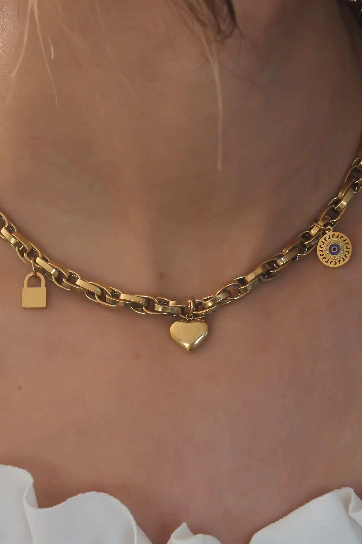Etiketler | Çelik Gold Renk Kalın Zincir Model Kalp Figür Kadın Kolye - EBJ250920W37815 |