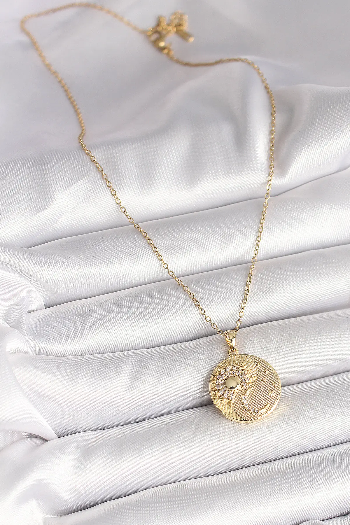 Etiketler | Gold Renk Zincir Zirkon Taşlı Ay Güneş İşlemeli Madalyon Model Kadın Kolye - EBJ250501W32736 |