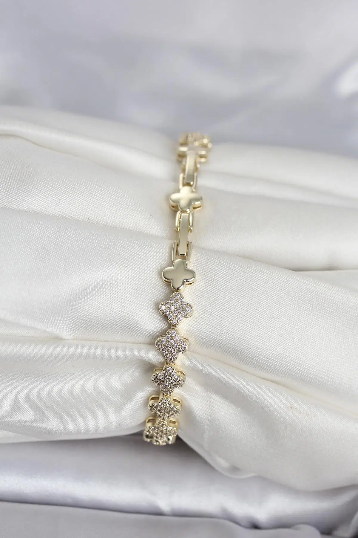 | Etiketler | Pirinç Gold Renk Yonca Model Sıralı Zirkon Taşlı Kadın Bileklik - EBJ260418W41903 |