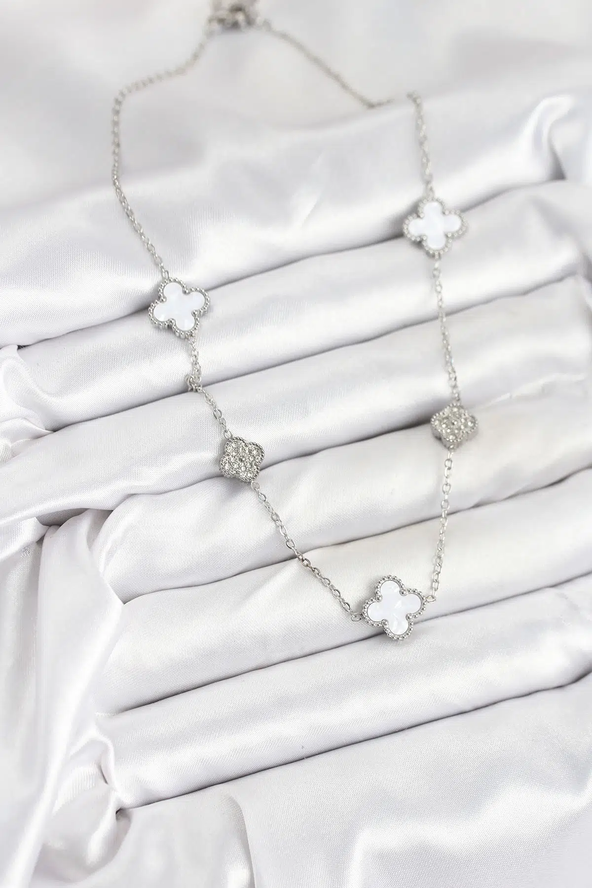 Etiketler | Zincir Gümüş Renk Beyaz ve Zirkon Taşlı Yonca Kadın Kolye - EBJ250920W37853 |