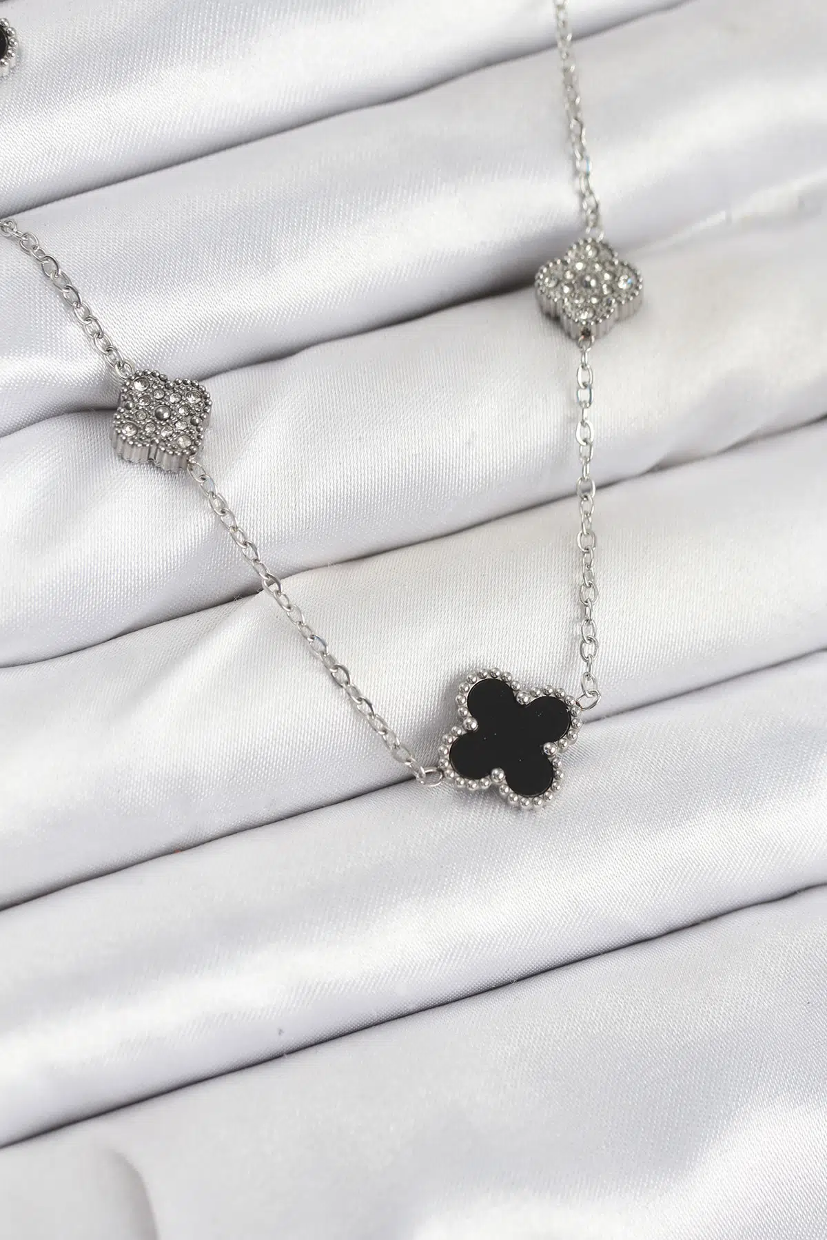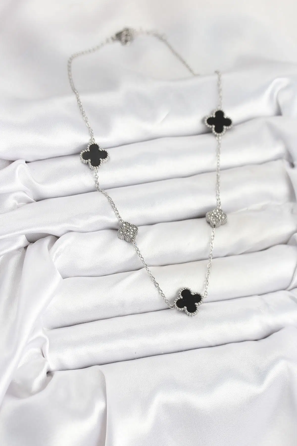 Etiketler | Zincir Gümüş Renk Siyah ve Zirkon Taşlı Yonca Kadın Kolye - EBJ250920W37854 |